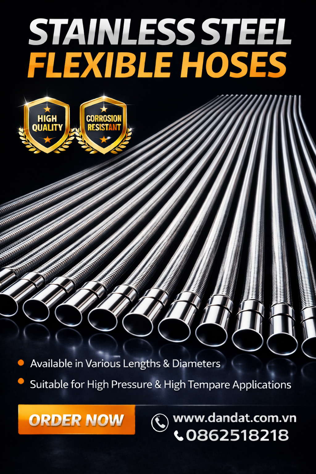 Dandat.Flex là thương hiệu chuyên sản xuất các loại khớp nối mềm (Flexible Metal Hose) với dây chuyền công nghệ hiện đại. Sản phẩm của Dandat.Flex không chỉ phổ biến tại thị trường nội địa mà còn được xuất khẩu nhờ chất lượng đạt tiêu chuẩn quốc tế (ISO 9001:2015).